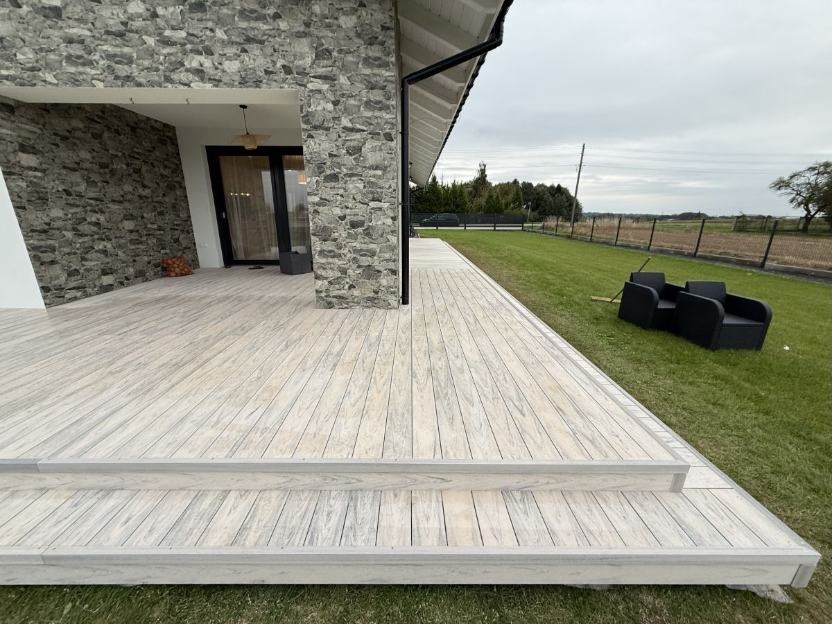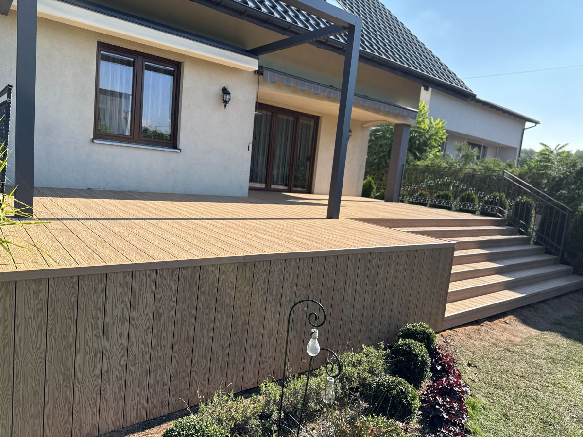 Kompozyt, egzotyczne drewno i płytki wentylowane. Odporne na UV, wilgoć i zarysowania. Taras, który zachwyca wyglądem i trwałością przez ponad 25 lat.