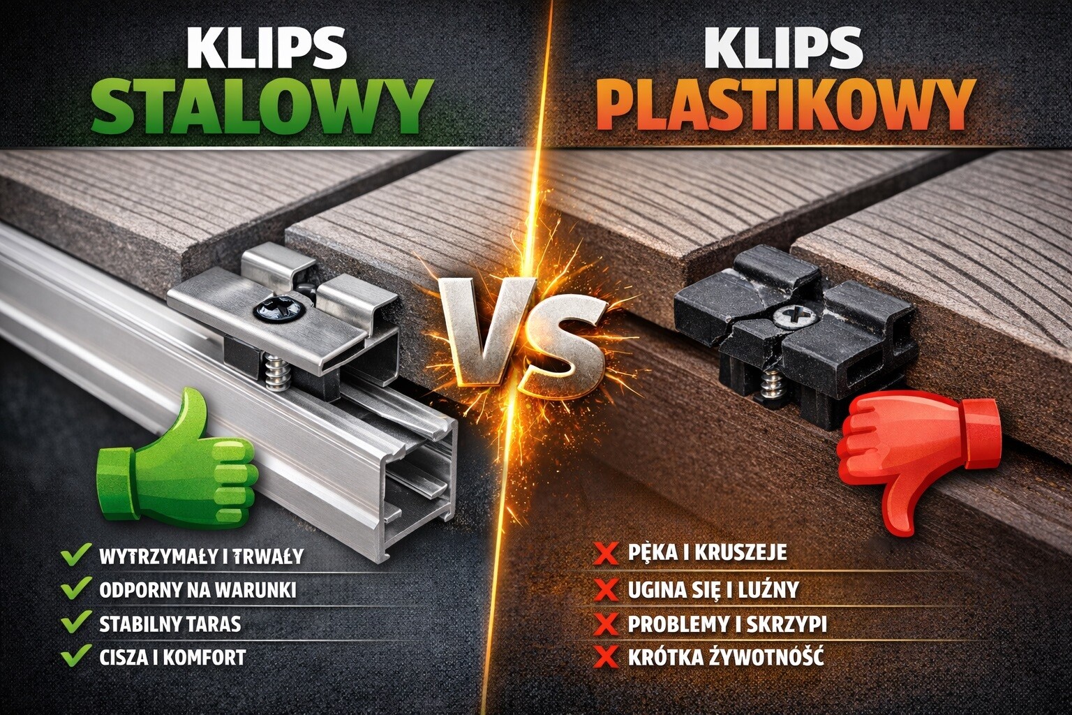 ➡️ Efekt? Taras na klipsach plastikowych zaczyna „klikać”, uginać się i traci stabilność.